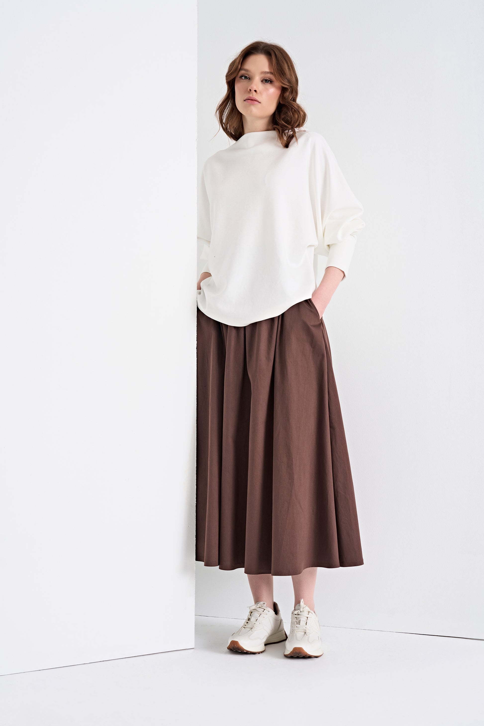 This chic outfit features a comfortable off-white boat neck long-sleeved top paired with a flowy, gathered midi skirt in a rich brown hue. This combination offers a relaxed yet stylish look perfect for everyday wear.