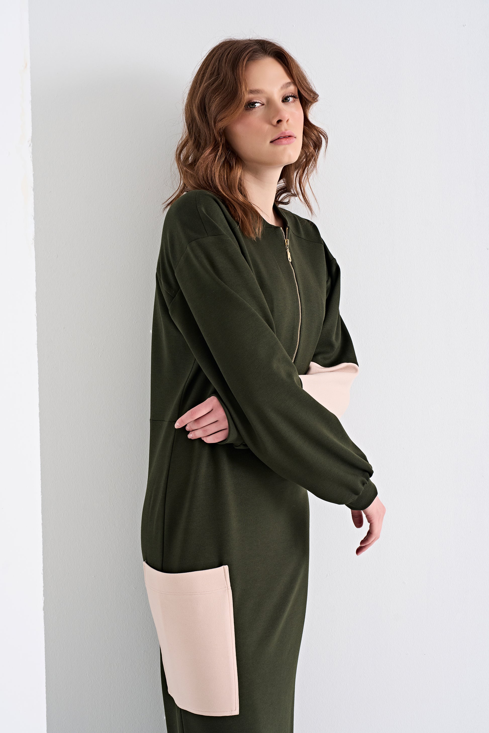 This modern maxi dress in a deep olive green features a unique zip-up front and stylish color-blocked accents in a light beige and soft beige on the sleeves and hip. This dress offers a contemporary and comfortable take on a classic silhouette.