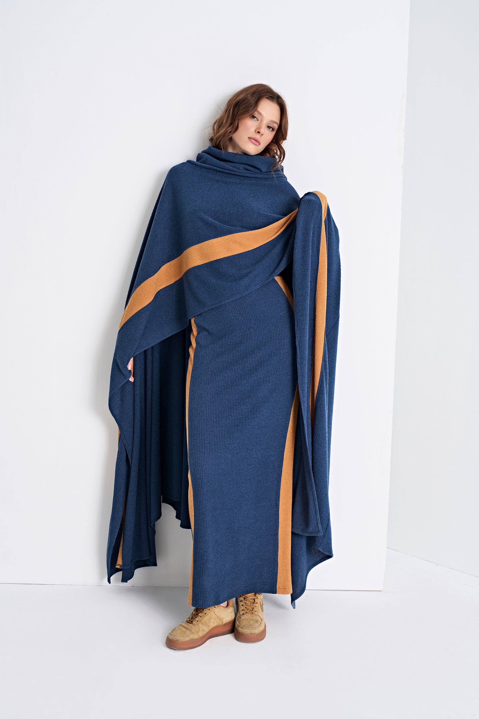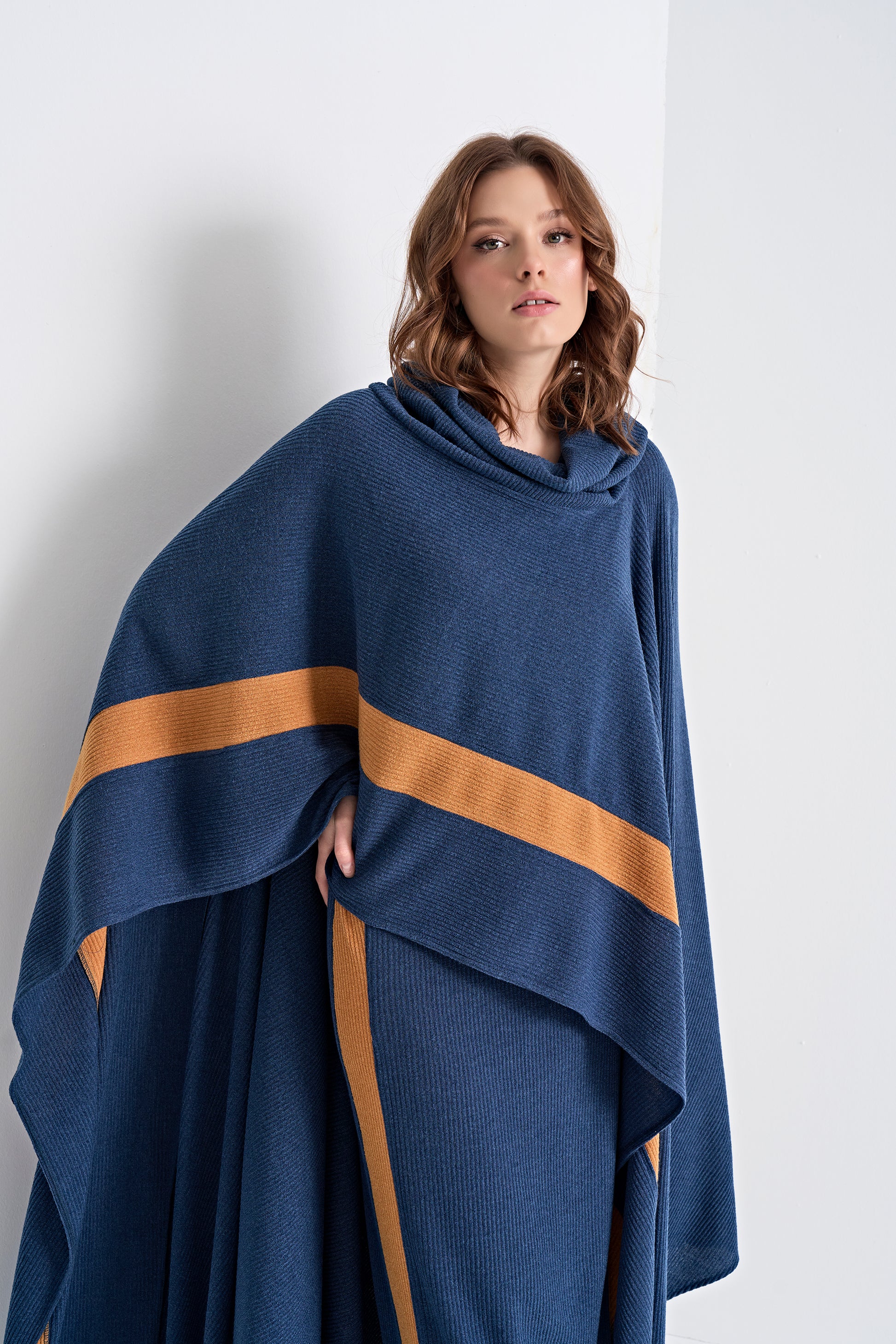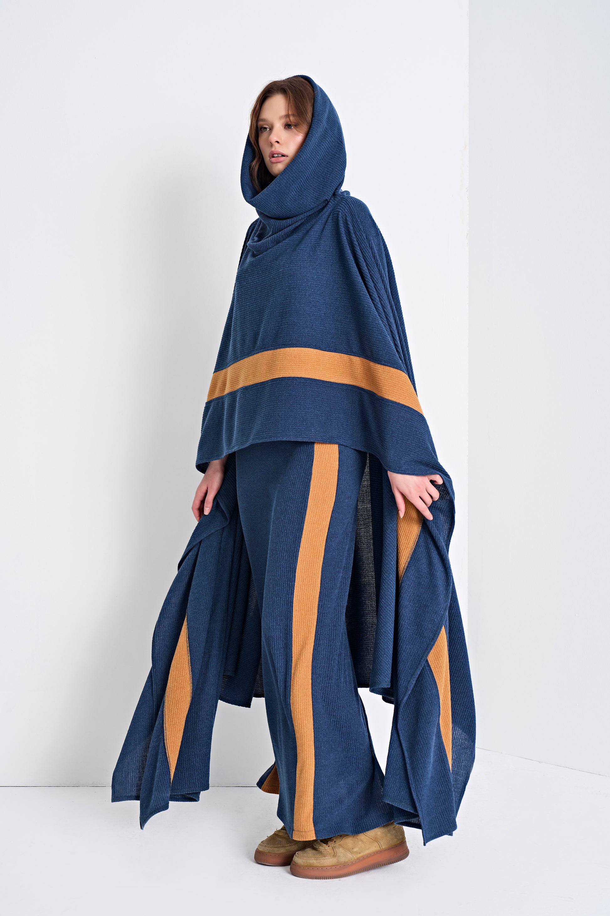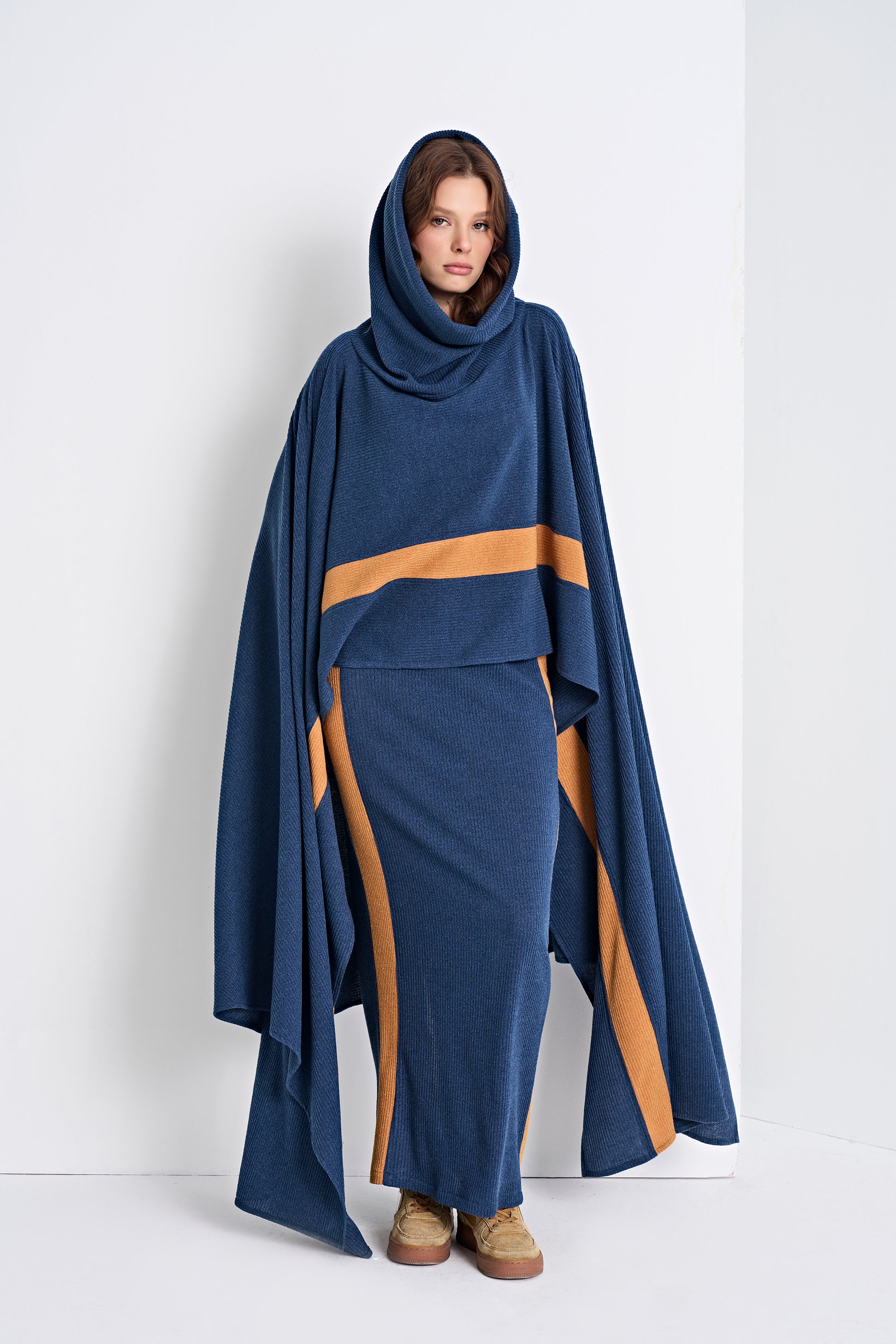 This striking two-piece set features a dramatic hooded knit poncho in a deep blue with contrasting caramel stripes, paired with a coordinating midi skirt. This unique ensemble offers both warmth and bold style, making a fashionable statement.