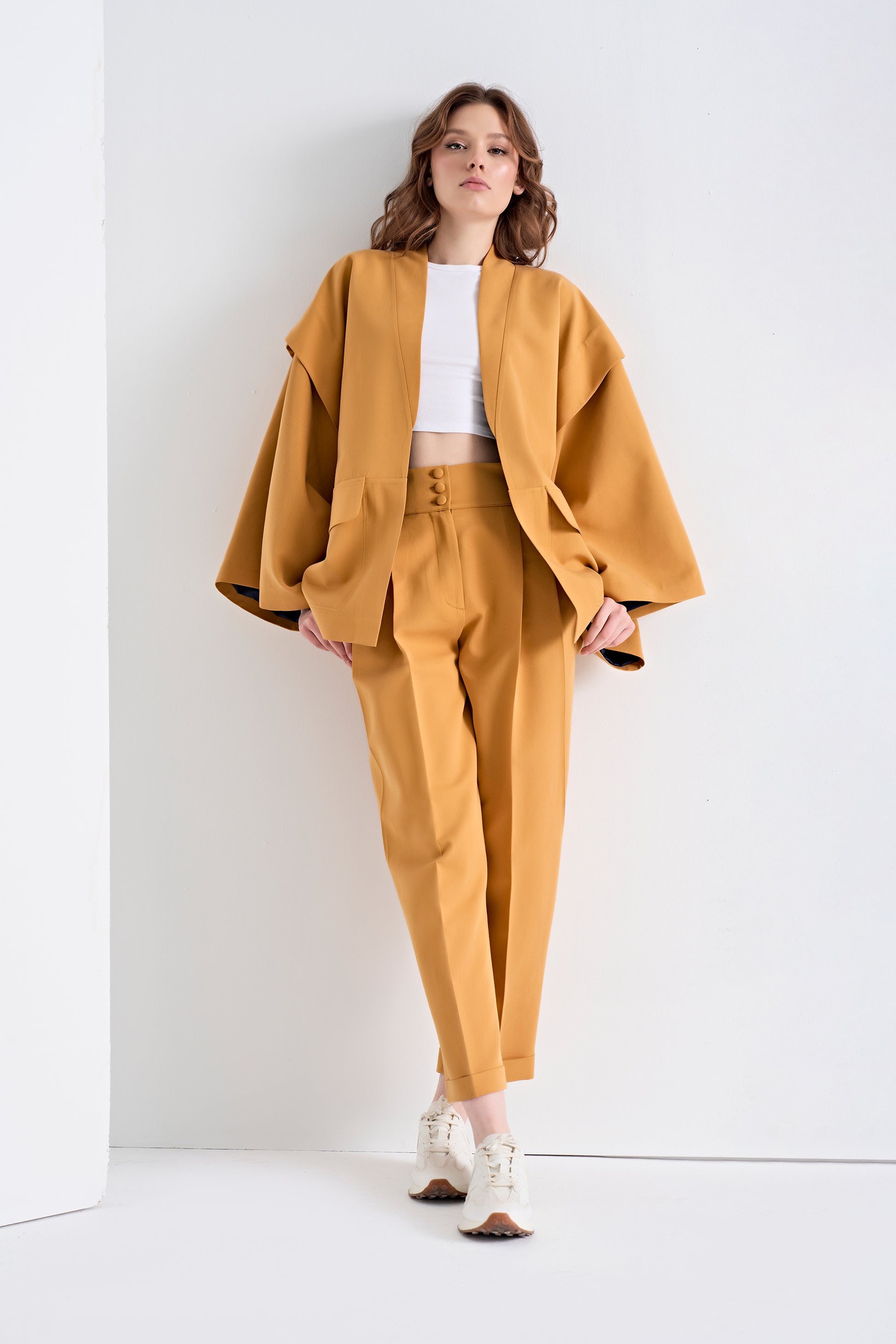 This fashionable two-piece set in a warm mustard yellow features an open-front jacket with unique layered, wide sleeves revealing a contrasting dark blue lining, paired with coordinating cropped pants with cuffed hems. This ensemble offers a stylish and contemporary silhouette.